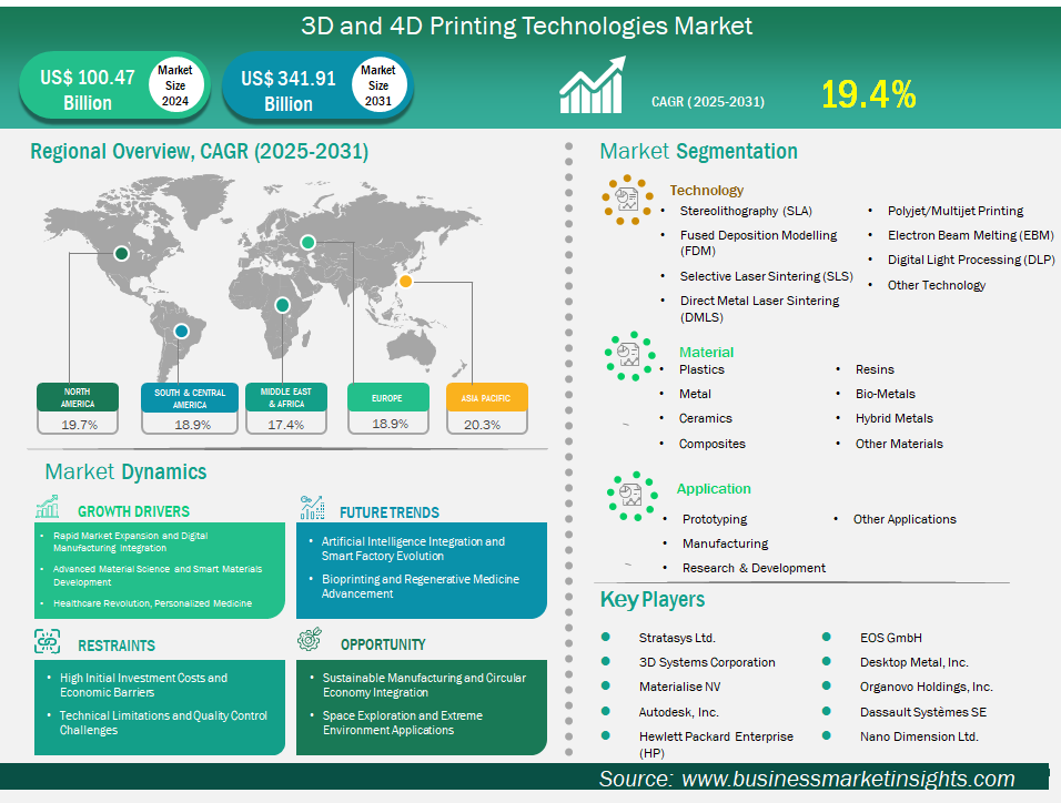 According to the Business Market Insights The Global 3D and 4D Printing Technology Market is on a transformative trajectory, with its market size expected to reach US$ 341,935.81 million by 2031, up from US$ 100,479.73 million in 2024. According to the latest industry analysis, the market is projected to record a robust CAGR of 19.4% from 2025 to 2031, fueled by innovations in additive manufacturing, rising demand for customized production, and expanding applications across healthcare, aerospace, and automotive sectors.