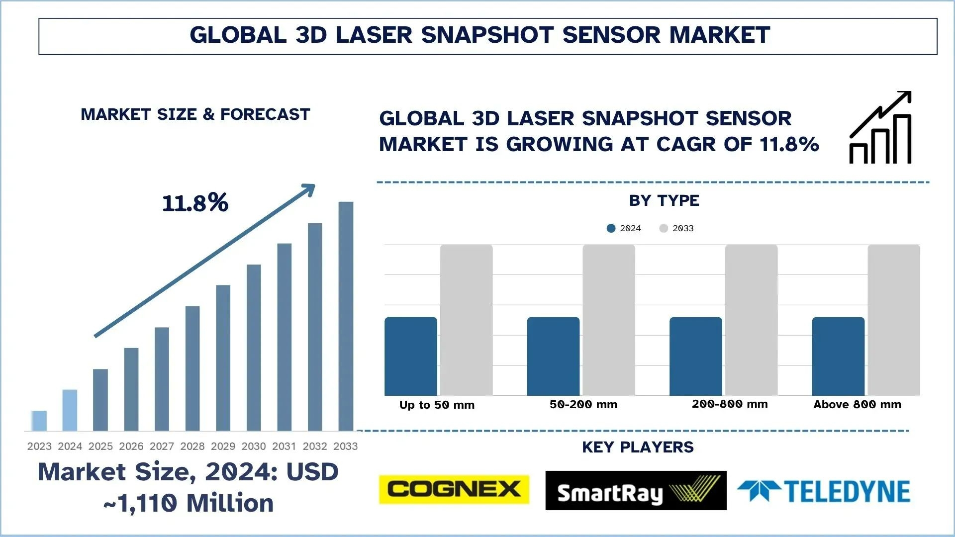 According to the UnivDatos, the rising demand for consumer goods and the automotive industries would fuel the demand for the 3D Laser Snapshot Sensor market. As per their “3D Laser Snapshot Sensor Market” report, the global market was valued at USD 1,110 million in 2024, growing at a CAGR of about 11.8% during the forecast period from 2025 - 2033 to reach USD million by 2033.