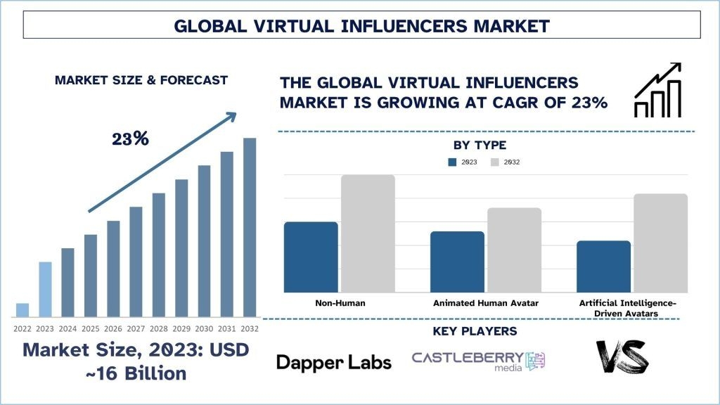 According to the UnivDatos, the growing use of social media platforms, rapid developments in AI, CGI, and machine learning, the rising shift to digital marketing, and metaverse integration drive the Virtual influencers market. As per their “Virtual influencers Market” report, the global market was valued at USD 16 Billion in 2023, growing at a CAGR of about 23% during the forecast period from 2024 - 2032 to reach USD billion by 2032.