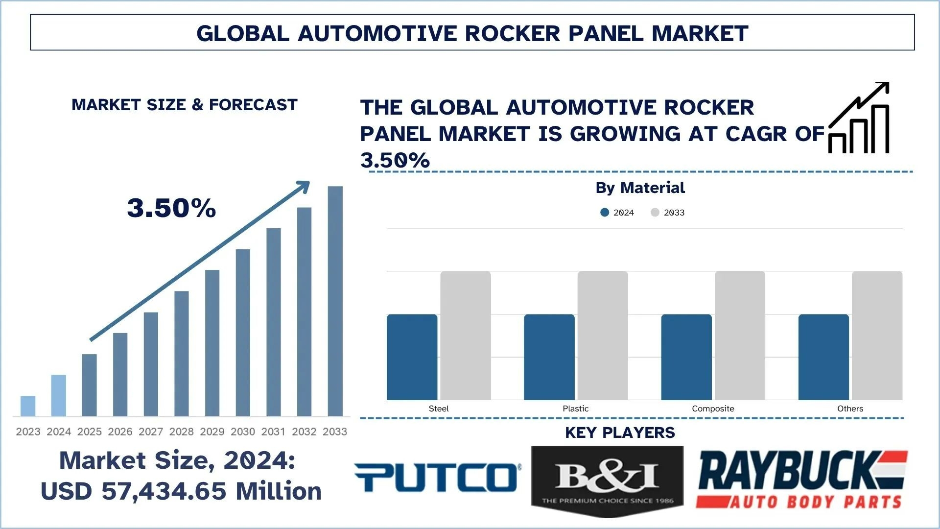 According to a new report by UnivDatos, The Automotive Rocker Panel Market is expected to reach USD million in 2033 by growing at a CAGR of 3.50%. The automotive rocker panel market is growing steadily due to the rising focus of manufacturers on vehicle safety, structural integrity, and the use of lightweight materials. The market growth is further driven by rising global vehicle production, increasing adoption of SUVs and electric vehicles (EVs), and strong safety and environmental regulations. Furthermore, materials innovation is an important factor shaping the market. High-strength steel remains dominant because of its durability, cost-effectiveness, and ease of manufacturing. Aluminum and composite panels are becoming more popular in electric vehicles and luxury cars because they are lightweight. Additionally, OEMs are investing heavily in advanced manufacturing technologies, such as hot stamping, laser welding, and corrosion-resistant coatings, to produce strong rocker panels, which further drives the growth of the market.
