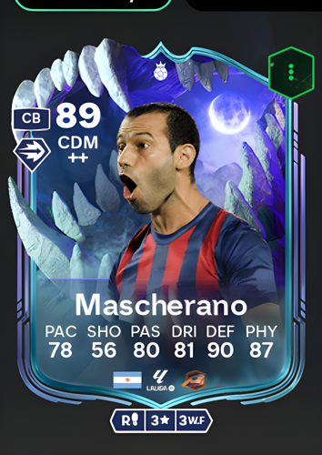 Javier Mascherano's Ultimate Scream Hero card is a formidable Central Defensive Midfielder boasting an overall rating of 89, equipped with standout attributes including a defensive rating of 90, physicality of 87, and an impressive dribbling ability of 81. As a CDM, this card excels in shielding the backline with its exceptional defensive awareness and robust tackling, allowing you to consistently break up opposition attacks and regain possession. His high physicality and balanced pace of 78 ensure he can cover ground effectively, while reliable passing at 80 facilitates smooth transitions from defense to attack, making him the ultimate midfield enforcer to control the tempo and secure your defensive third throughout the match.