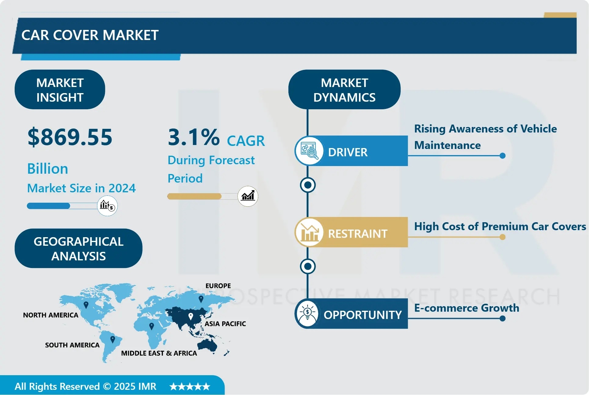 According to a new report published by Introspective Market Research, the Global Car Cover Market by Material, Vehicle Type, Distribution Channel, and End-User, valued at USD 869.55 Billion in 2024, is projected to reach USD 1,110.1 Billion by 2032, growing at a CAGR of 3.1% from 2025 to 2032. This steady expansion is fueled by the continued global growth in vehicle ownership, rising consumer awareness about vehicle preservation, increasing incidence of extreme weather events, and the growing value of vehicles as long-term assets requiring protection from environmental and incidental damage.